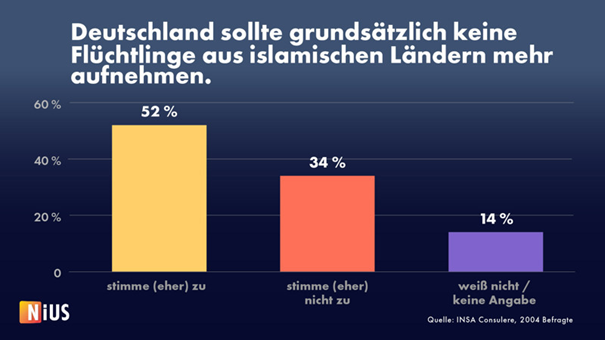 Eine INSA-Umfrage vom Frühjahr 2024 ergab, dass die Mehrheit der deutschen Bevölkerung insgesamt (52 Prozent) keine Flüchtlinge aus islamischen Ländern mehr aufnehmen möchte.