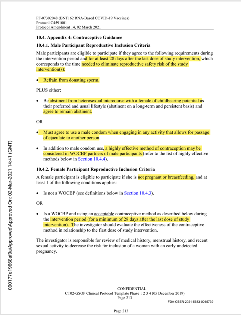 Das Spannende am zweiten Dokument, welches eine Spermaspende untersagt und Verhütung bis 28 Tage nach der zweiten Spritze vorschreibt, ist, dass es vom 2. März 2021 ist. Da war das Produkt bereits auf dem Markt und den damit injizierten Menschen wurde das so nicht mitgeteilt.